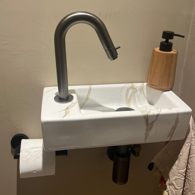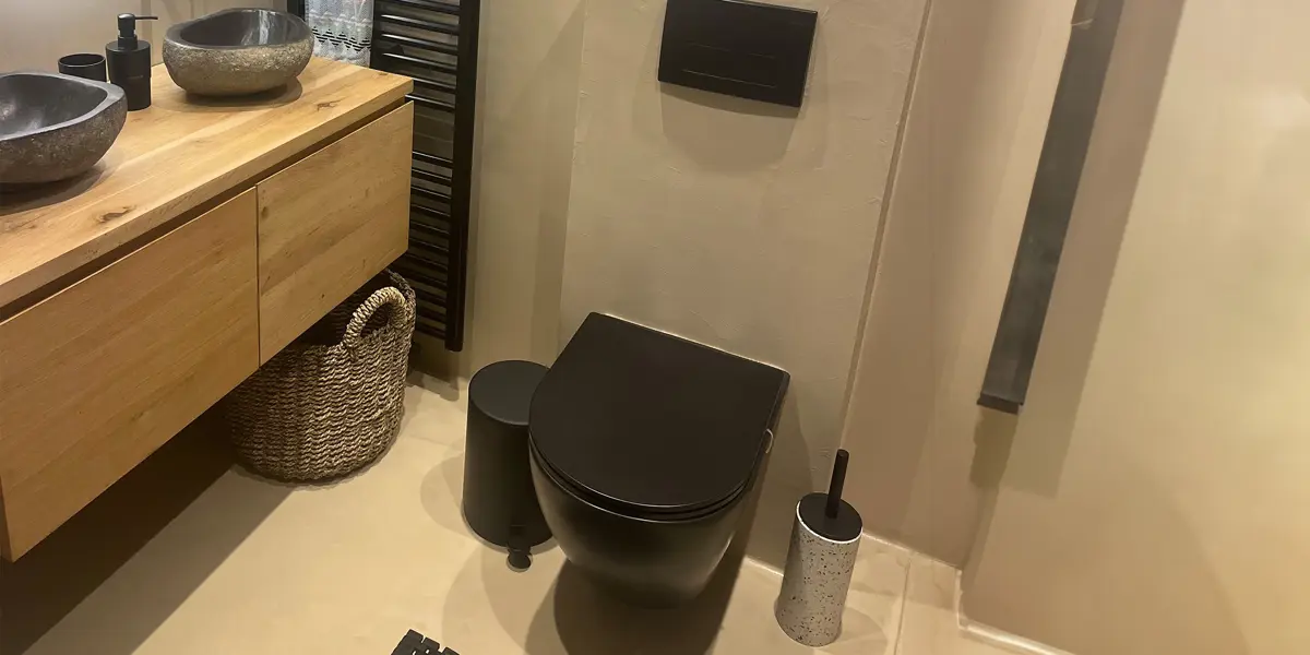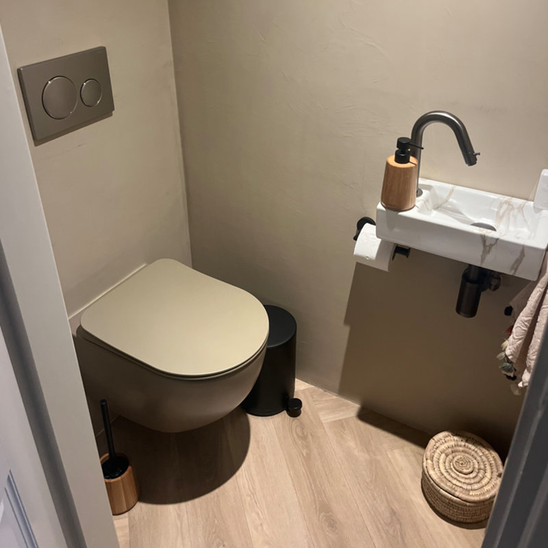 Naast de badkamer heeft het stel ook het toilet gerenoveerd. Sterre en Sander kozen ervoor om de stijl door te trekken naar deze kleine ruimte. Het toilet is nu voorzien van dezelfde beige betonstuc wanden, waardoor het perfect aansluit bij de rest van de badkamer. Ze kozen voor een wit fonteintje met marmerlook en een stijlvolle zwarte kraan. In combinatie met de eikenhouten Earth accessoires geeft dit een warme sfeer aan het toilet. Ditzelfde hout accent vind je boven in de badkamer weer terug in het meubel.