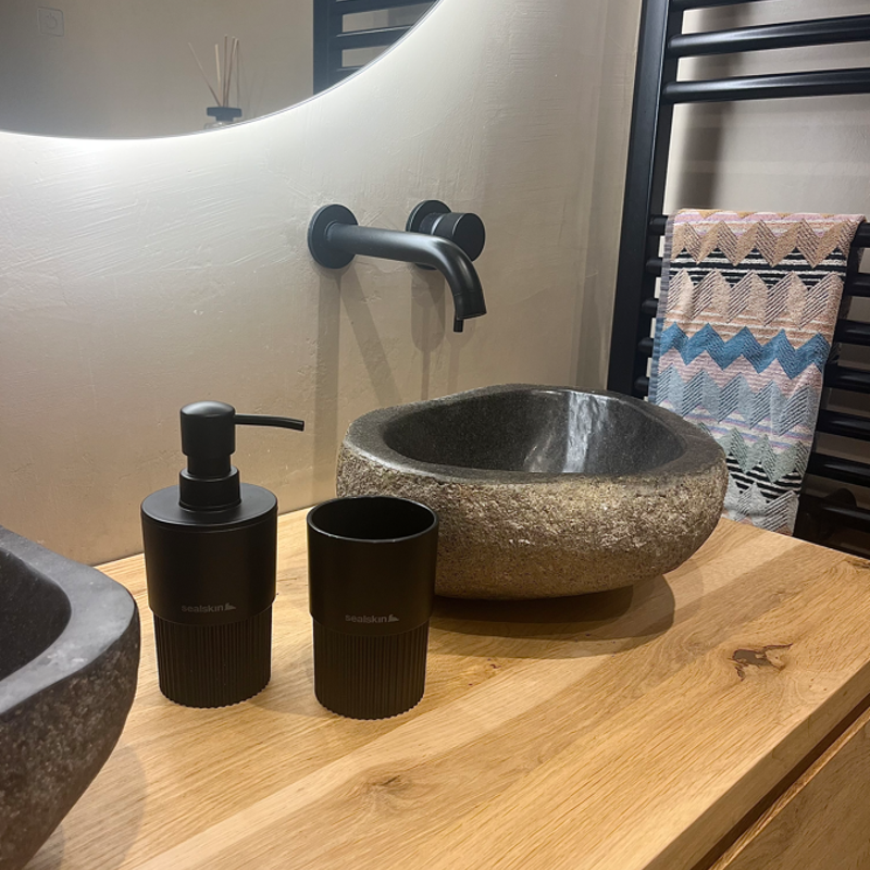 Om de badkamer helemaal af te maken, kozen Sterre en Sander voor stijlvolle accessoires van Sealskin. De zwarte badmat, toiletborstelhouder en zeepdispenser van de Sealskin Brave serie sluiten perfect aan op de zwarte accenten van deze badkamer. Ze zorgen voor een stoer contrast bij het beige betonstuc. En eerlijk is eerlijk: wie wil de kleur van de badkamerkranen en douche nu niet laten matchen met je accessoires?!