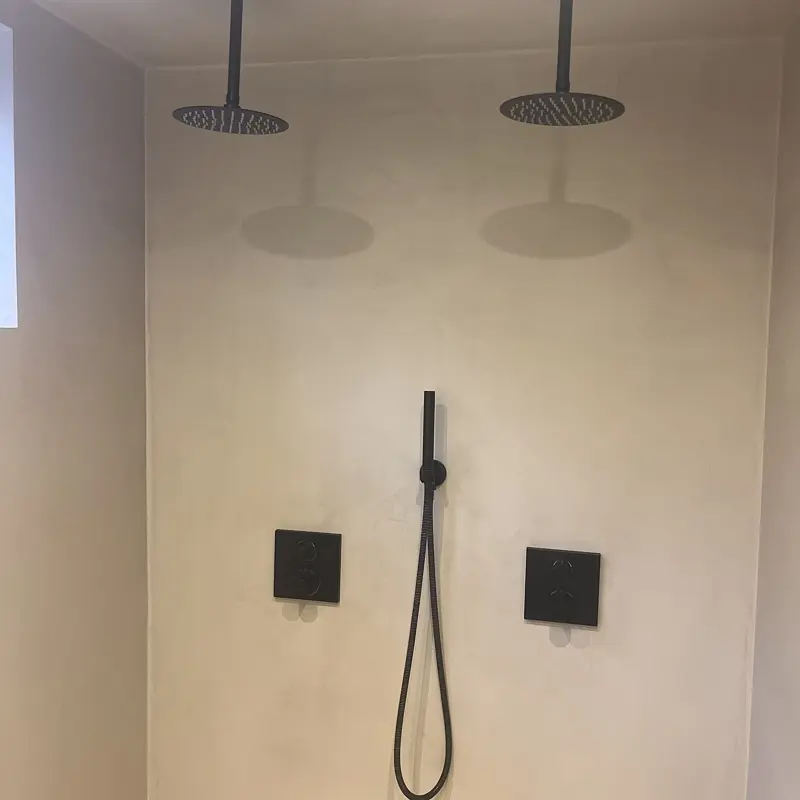 Bij het ontwerpen van de badkamer lieten Sterre en Sander zich inspireren door de mooie badkamer van hun vakantieverblijf. ‘’We wilden dezelfde sfeer bij ons thuis terug laten komen,’’ vertelt Sterre. Ze kozen daarom voor betonstuc in een warme zandkleur en combineerden dit met zwart sanitair voor een stoer tintje. Deze keuze zorgde voor een moderne, strakke uitstraling die tegelijkertijd onderhoudsvriendelijk is. Betonstuc is namelijk waterproof en heel gemakkelijk schoon te houden.