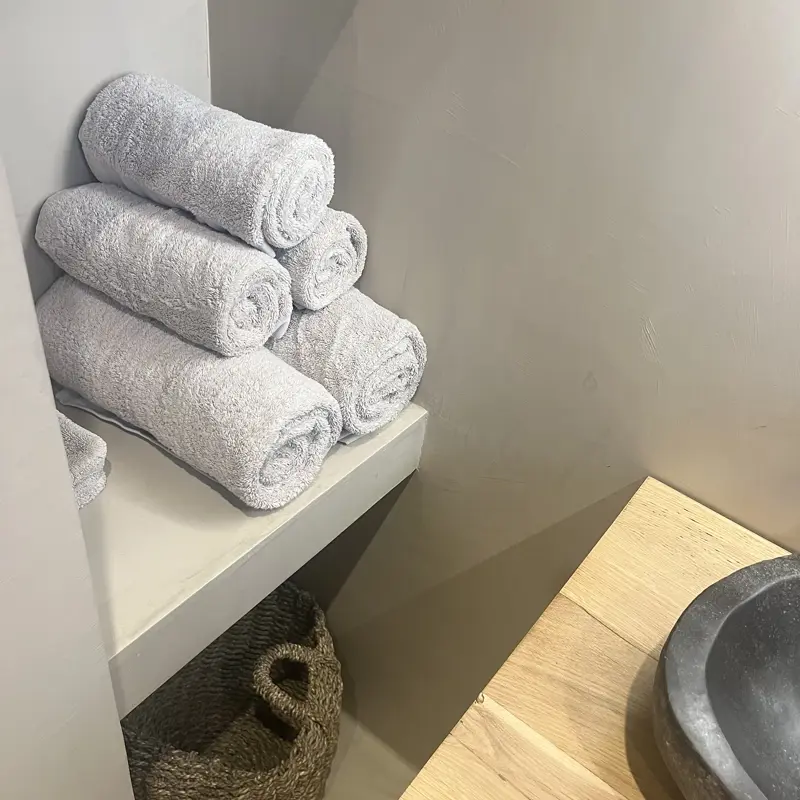 Naast het toilet en de dubbele wastafel kozen ze voor een slim nisje naast het wastafelmeubel om handdoeken op te bergen. Zoals je ziet zorgt het oprollen van de handdoeken direct voor een luxe uitstraling in de badkamer.