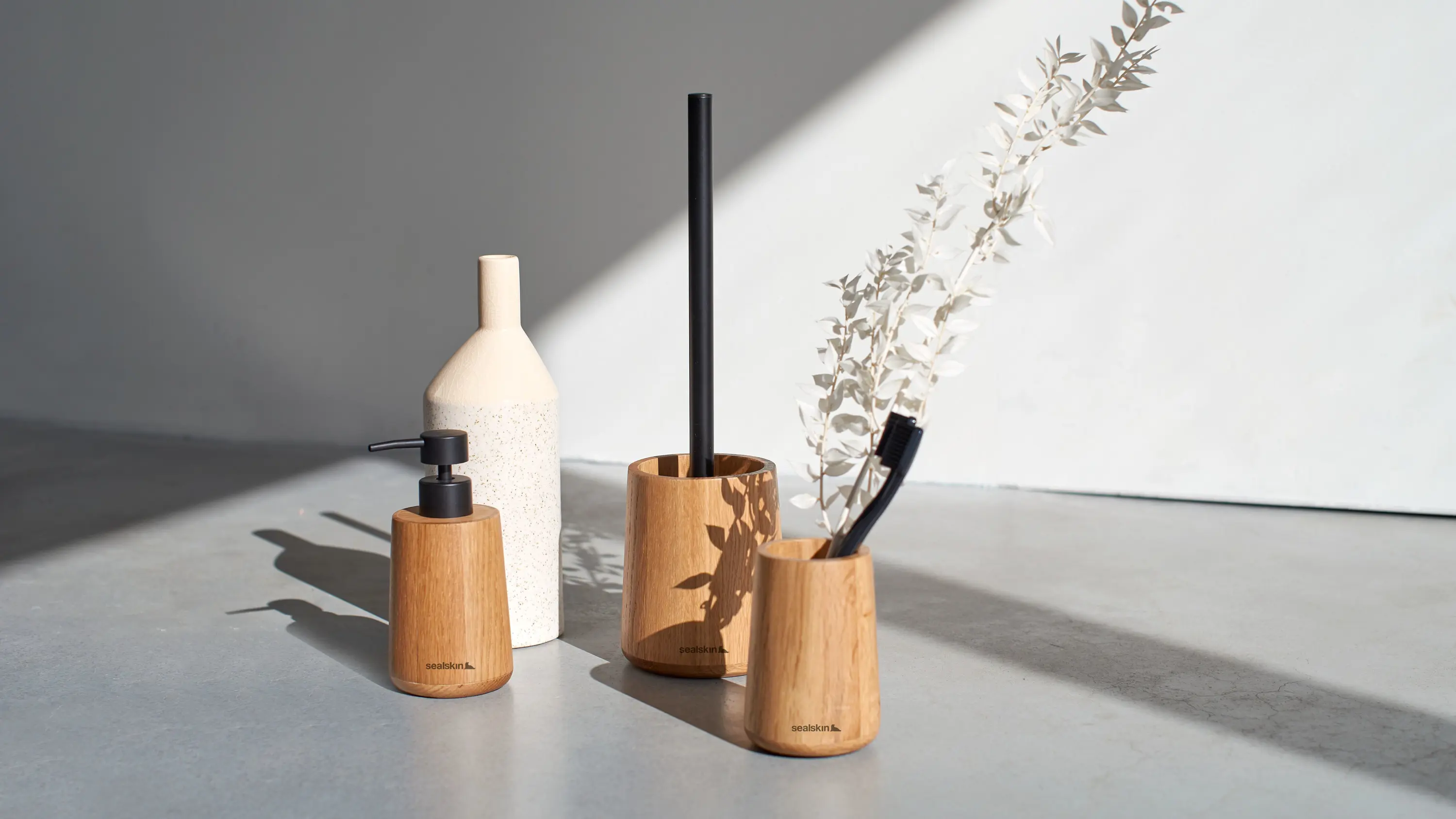 Een ander kenmerk van de Japandi-stijl is het gebruik van natuurlijke materialen. Hout speelt hierbij een centrale rol. Kies voor warme houttinten zoals walnoot of esdoorn voor de vloeren en ga voor een houten badkamermeubel. Wil je juist eenvoudig de Japandi-stijl toevoegen aan je badkamer? Ga dan voor een nieuwe set accessoires van natuurlijke materialen. Zo kun je óók met een kleine ingreep en budget een Japandi badkamer creëren. De Sealskin Earth met eikenhout of Sealskin Grace met bamboo accenten passen perfect in een Japandi badkamer.