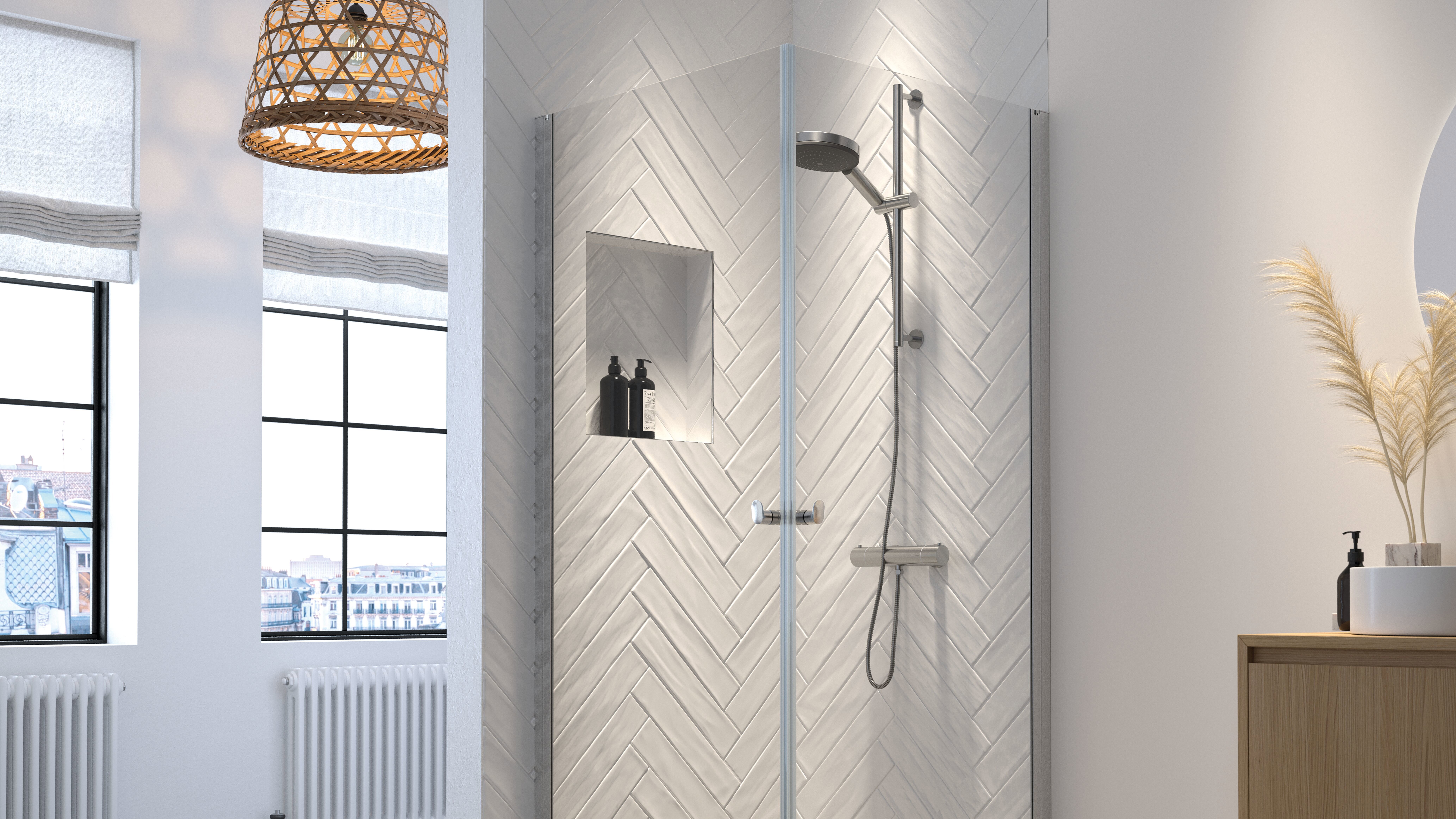 Voor een strakke en geïntegreerde look ga je voor een douche in een nis. Deze opstelling maakt optimaal gebruik van de ruimte en creëert een afgesloten douche. Hierdoor geniet je van extra warmte en blijft de rest van je badkamer goed droog.