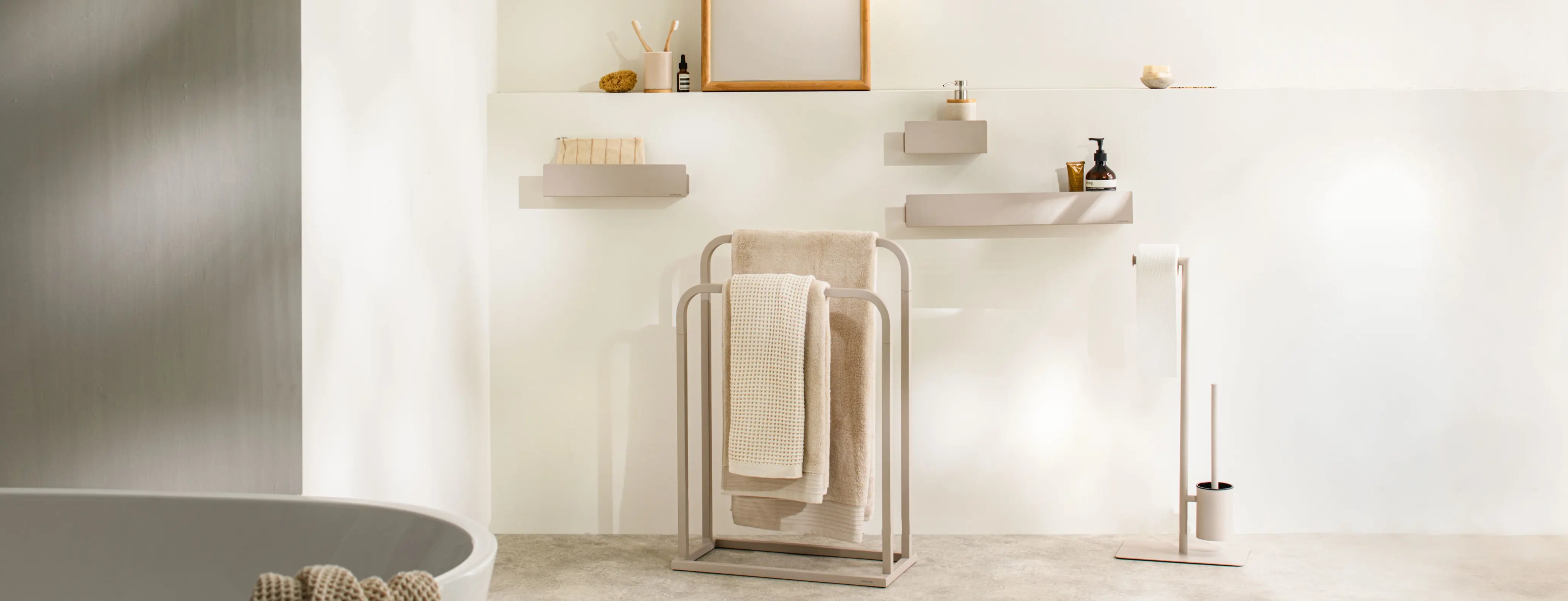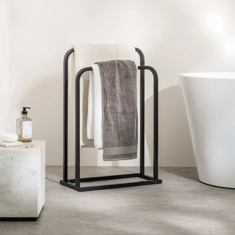 Een vrijstaand handdoekrek dat niet alleen praktisch is, maar ook een eyecatcher vormt in je badkamer. Verkrijgbaar in diep zwart of de nieuwe greige tint ideaal om warmte en rust te brengen in je interieur.