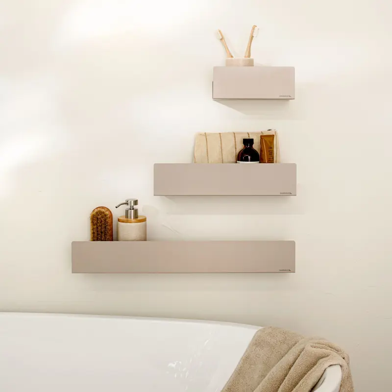 Wandrekken in verschillende maten, met slimme afvoergleuven, waarmee je je badkamermuur in een handomdraai verandert in een strakke en georganiseerde opbergplek. Combineer meerdere rekken voor een speels effect.