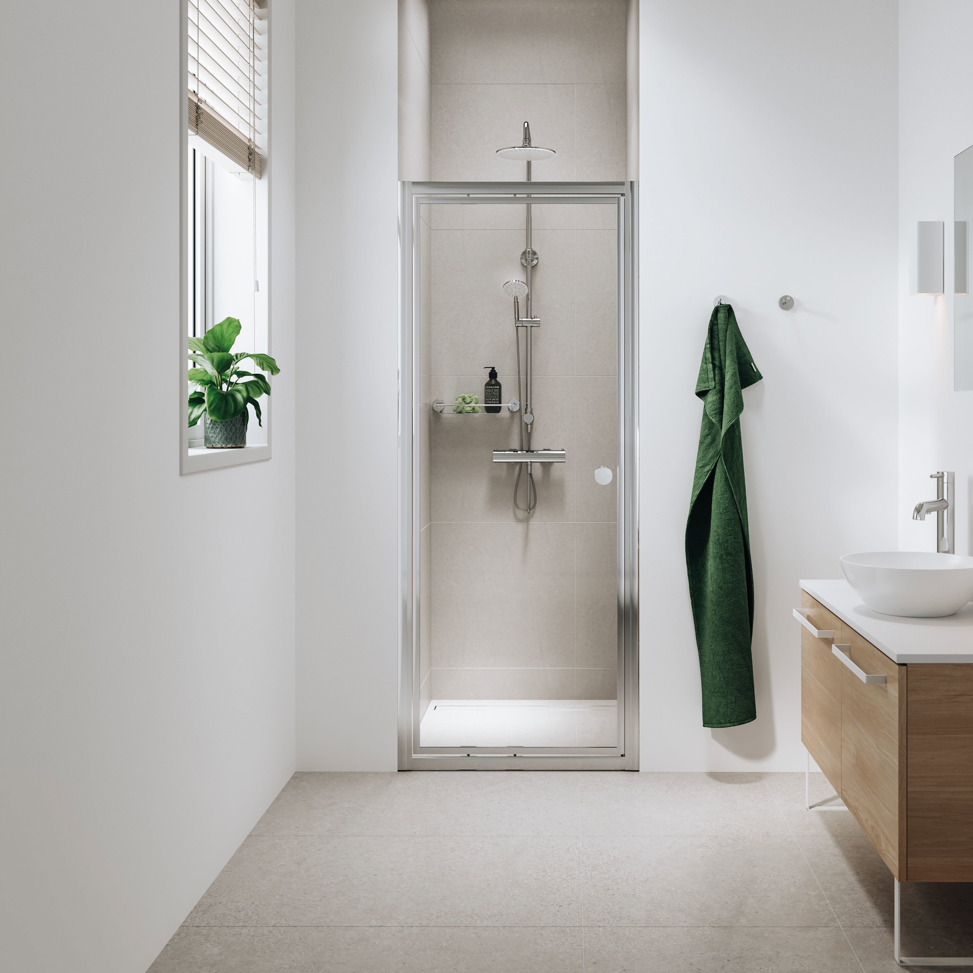 Een draaideur is een klassieke en veelgekozen oplossing. Deze opent naar buiten (of deels naar binnen) en biedt een ruime instap. Wel moet je rekening houden met voldoende draaicirkel in de badkamer.
