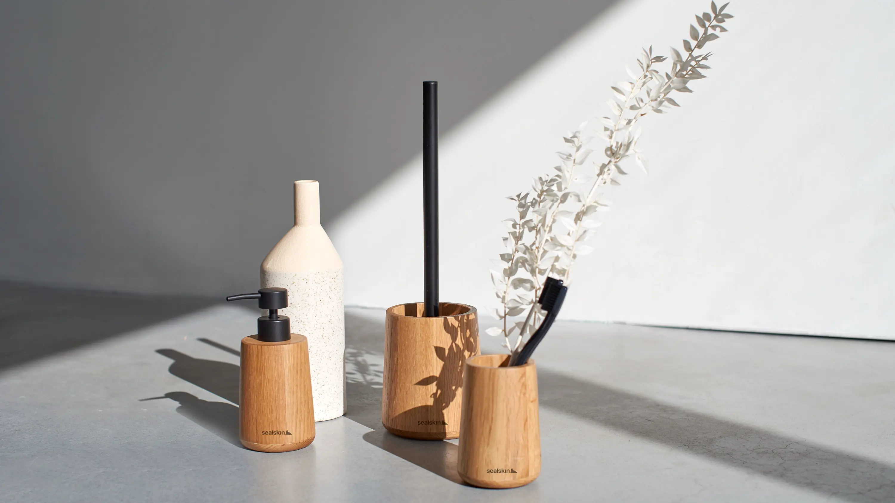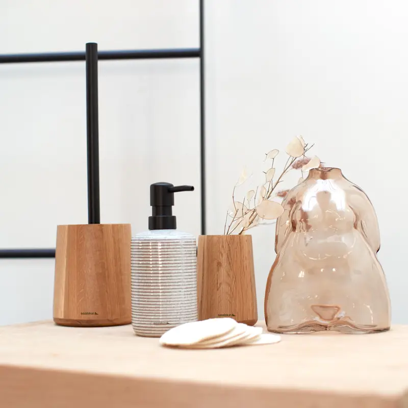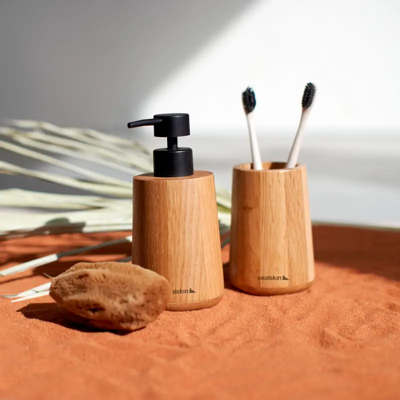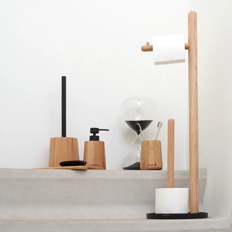 De serie Earth brengt het beste van twee werelden samen, namelijk natuurlijk design gecombineerd met een vleugje industrieel. De accessoires zijn gemaakt van eikenhout en voorzien van matzwart metalen elementen; een mix van materialen, die passend is in de trend van nu en jouw badkamer een aangename warmte geeft. Earth is verkrijgbaar als beker, zeepdispenser, toiletborstelhouder en staande toiletrolhouder.