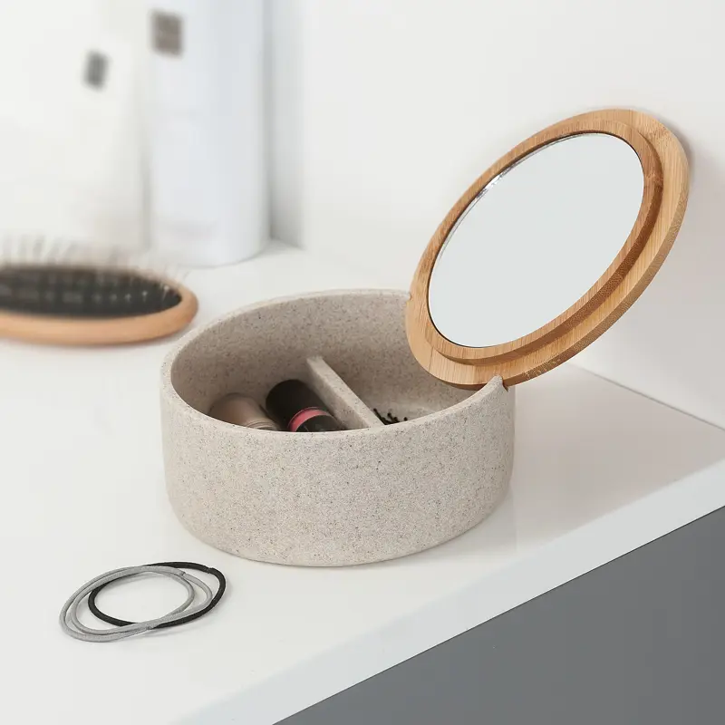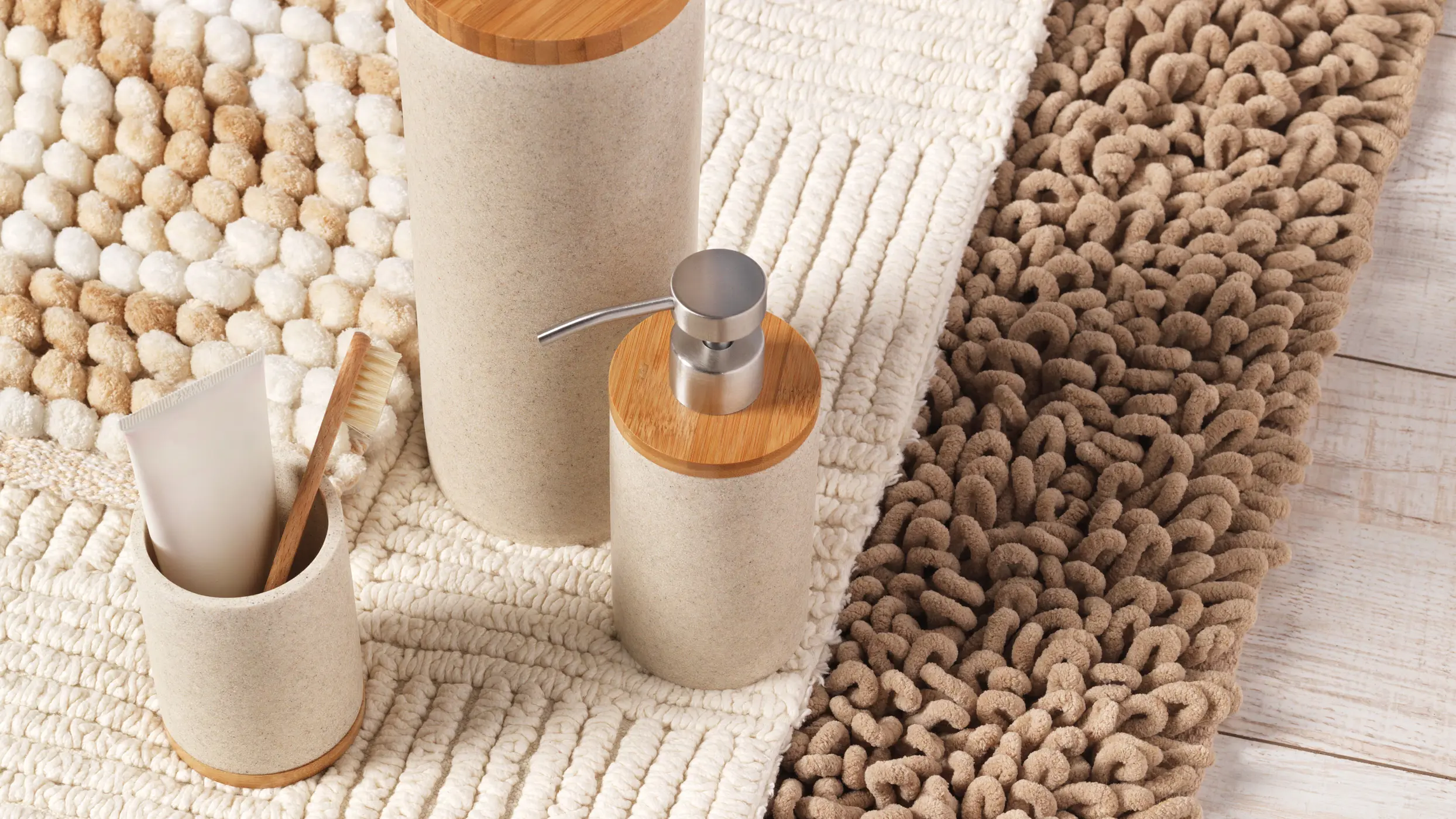 Gecombineerde materialen is de trend van nu. De Sealskin Grace serie, uitgevoerd in zandkleurig en wit polyresin gecombineerd met bamboe accenten, sluit daar perfect bij aan. De serie bestaat uit een zeepdispenser, toiletborstel met houder, tandenborstelhouder en beker.