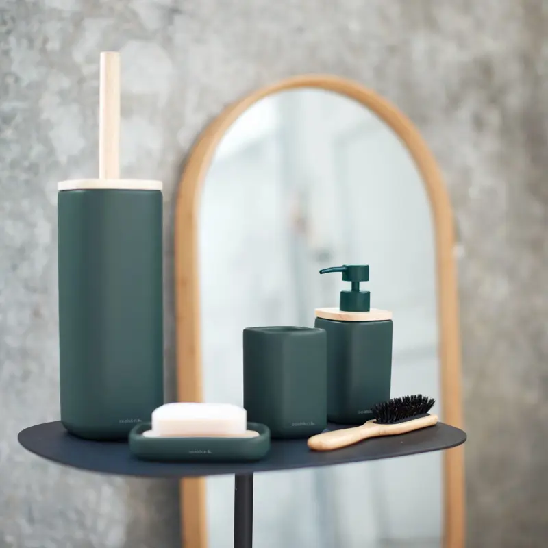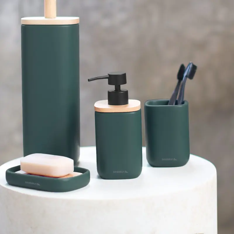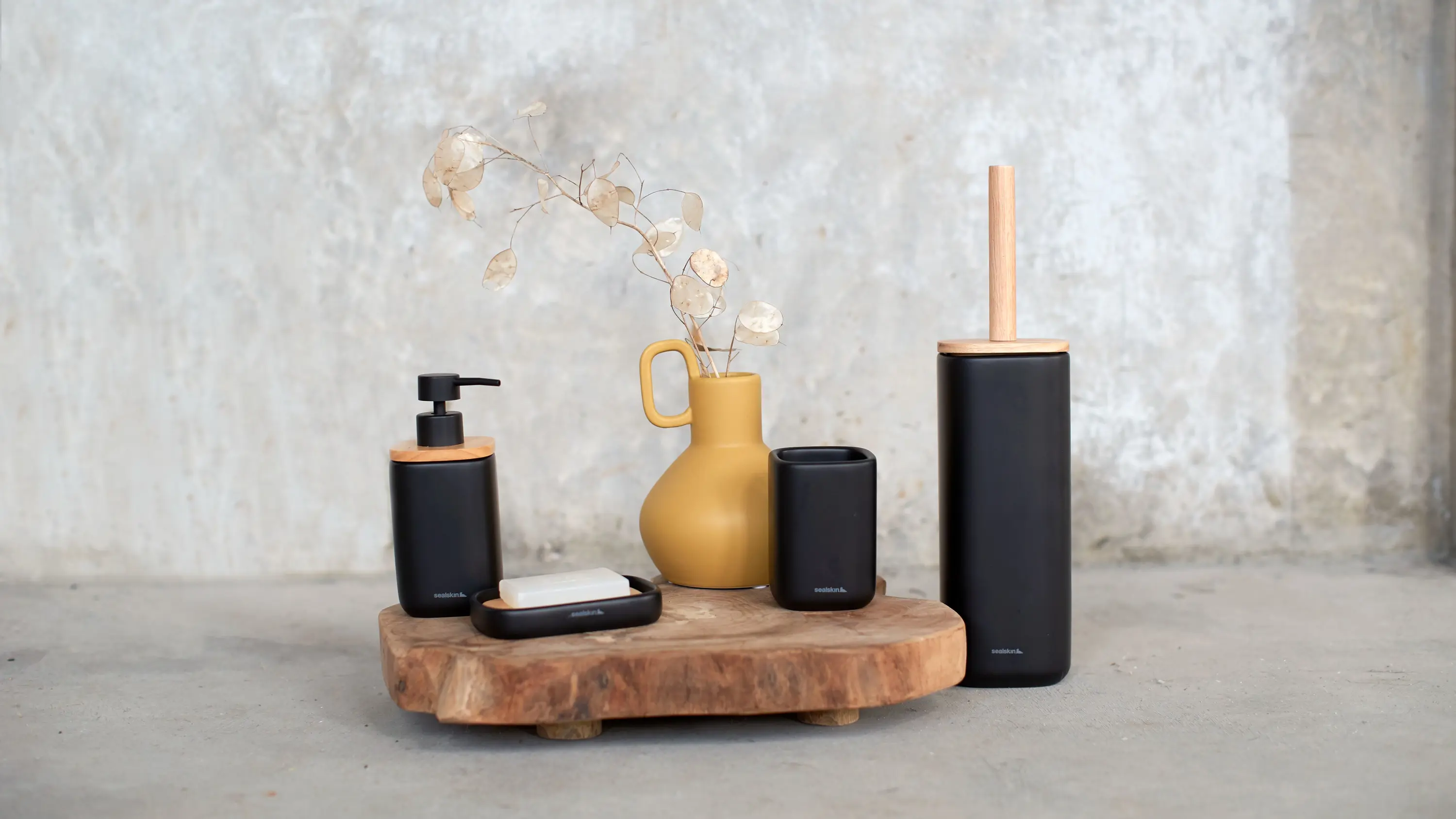 Sealskin biedt met de serie Mind accessoires met organische vormen en zacht afgeronde hoeken. Keramiek wordt bij Mind stijlvol gecombineerd met houtaccenten. Verkrijgbaar in de kleuren zwart en groen is deze serie de sleutel tot jouw zen-moment in de badkamer. Mind biedt een toiletborstelhouder, beker, zeepdispenser, zeepschaal en een pedaalemmer. Kunnen we deze serie niet koppelen aan de japandi trend? Eenvoud, rust, natuurlijke materialen en kleur.