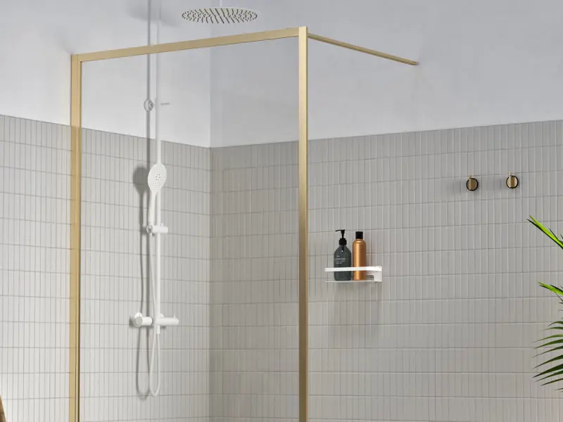 Deze inloopdouche type A3 uit de Contour-serie is met zijn geborstelde gouden frame ideaal om jouw badkamer te upgraden. De details zijn subtiel, maar zeker niet te missen. Dankzij het minimalistische design heeft deze inloopdouche een ruimtelijke uitstraling. Ideaal voor in de kleinere badkamer. Het 6 mm dikke veiligheidsglas is daarnaast voorzien van een antikalklaag, waardoor je douche langer helder blijft. De stabilisatiesteun van 1 meter is tot iedere gewenste lengte in te korten en zelfs onder een hoek te monteren. Zo past je Contour inloopdouche vrijwel altijd.