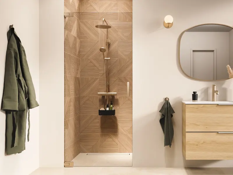Geef extra comfort aan je badkamer met de Pure draaideur voor een nis. Dankzij zijn minimalistische uitstraling oogt je badkamer direct ruimtelijk en open. De deur is 80 cm breed en maar liefst 200 cm hoog, voor meer warmte en comfort tijdens het douchen. De hoogwaardige RVS-bevestigingen zorgen voor een vlakke verbinding met het 8 mm dikke veiligheidsglas dat behandeld is met antikalk-coating. Zo blijft het glas helder en is het makkelijk te drogen na het douchen. Wie wil dat nou niet? Deze draaideur kan zowel naar binnen als naar buiten worden geopend en beschikt over een autoclose-systeem waardoor de deur gemakkelijk sluit. De scharnieren en de handgreep zijn subtiel uitgevoerd in de kleur geborsteld goud. Dit geeft je badkamer een luxe uitstraling.