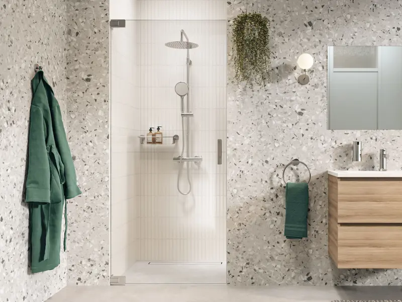 Geef extra comfort aan je badkamer met de Pure draaideur voor een nis. Dankzij zijn minimalistische uitstraling oogt je badkamer direct ruimtelijk en open. De deur is 80 cm breed en maar liefst 200 cm hoog, voor meer warmte en comfort tijdens het douchen. De hoogwaardige RVS-bevestigingen zorgen voor een vlakke verbinding met het 8 mm dikke veiligheidsglas dat behandeld is met antikalk-coating. Zo blijft het glas helder en is het makkelijk te drogen na het douchen. Wie wil dat nou niet? Deze draaideur kan zowel naar binnen als naar buiten worden geopend en beschikt over een autoclose-systeem waardoor de deur gemakkelijk sluit. De scharnieren en de handgreep zijn uitgevoerd in de kleur zilver hoogglans. Een tijdloze afwerking die goed past in een moderne badkamer.