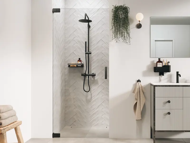 Geef extra comfort aan je badkamer met de Pure draaideur voor een nis. Dankzij zijn minimalistische uitstraling oogt je badkamer direct ruimtelijk en open. De deur is 80 cm breed en maar liefst 200 cm hoog, voor meer warmte en comfort tijdens het douchen. De hoogwaardige RVS-bevestigingen zorgen voor een vlakke verbinding met het 8 mm dikke veiligheidsglas dat behandeld is met antikalk-coating. Zo blijft het glas helder en is het makkelijk te drogen na het douchen. Wie wil dat nou niet? Deze draaideur kan zowel naar binnen als naar buiten worden geopend en beschikt over een autoclose-systeem waardoor de deur gemakkelijk sluit. De scharnieren en de handgreep zijn uitgevoerd in de kleur mat zwart. Een stoere afwerking die goed te combineren is met talloze badkamerstijlen.
